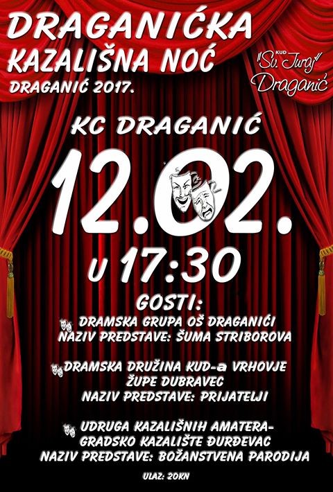 12.2.17. u KC Draganić održana je DRAGANIĆKA KAZALIŠNA NOĆ na kojoj smo ugostili 3 dramske družine. Spomenut ćemo najprije najudaljenije goste a to je Udruga kazališnih amatera Gradskog kazališta Đurđevac s predstavom „Božanstvena parodija“ u režiji Karla Kučande; zatim dramsku družinu KUD-a „Vrhovje“ Župe Dubranec koji su izveli predstavu Izvora Oreba i Emilije Kalavaris pod